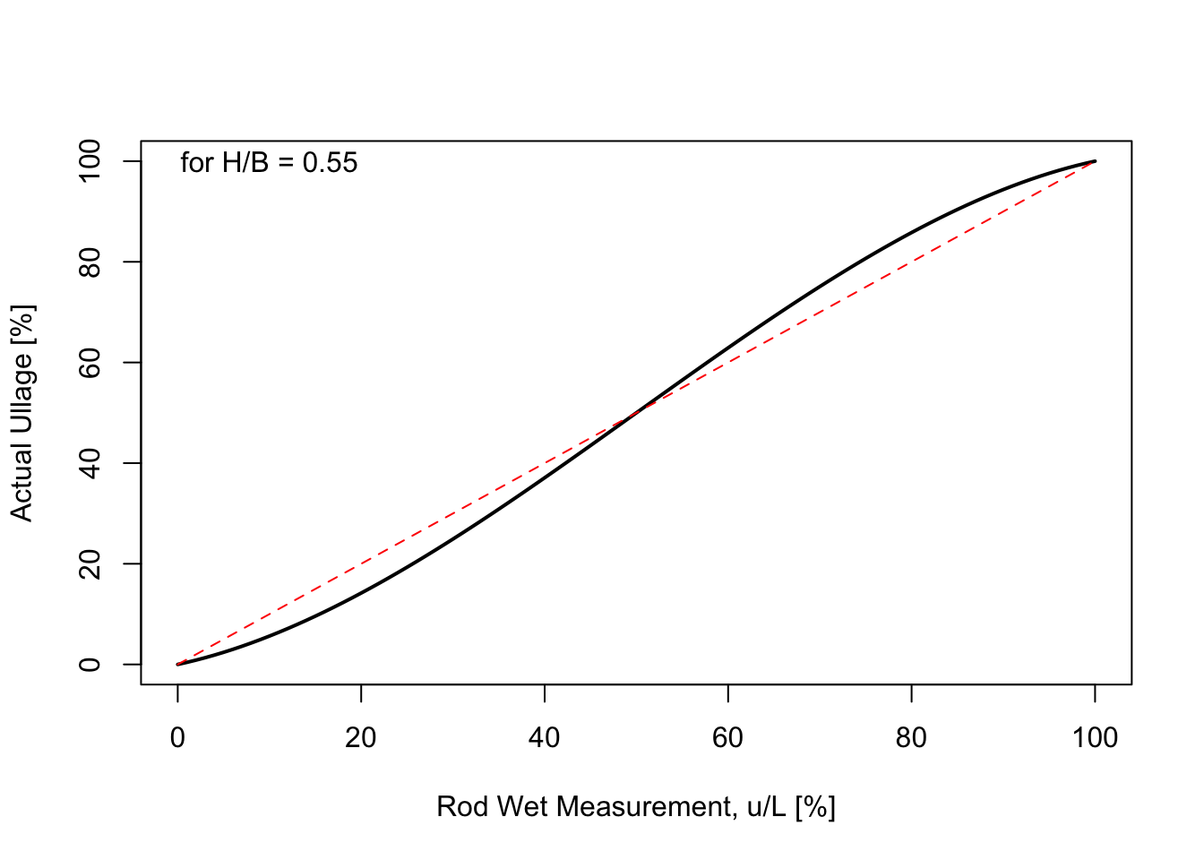 \[ U/V_0 = \frac12 + \frac{u}{L} \frac{ 12(a/L)^2 - 4(u/L)^2 }{ 12(a/L)^2 - 1 }. \] Earlier we noted that for a spheroidal cask, \((L/a)^2 = 4(1-(H/B)^2)\), so we can put this into the equation above. Also, it would be much more convenient to measure \(u\) from the bottom of the cask rather than from its mid-point, so we want to re-define \(u \rightarrow u-L/2\). Substituting these two relationships we arrive at the fraction of the cask filled as a function of the ullage measurement: