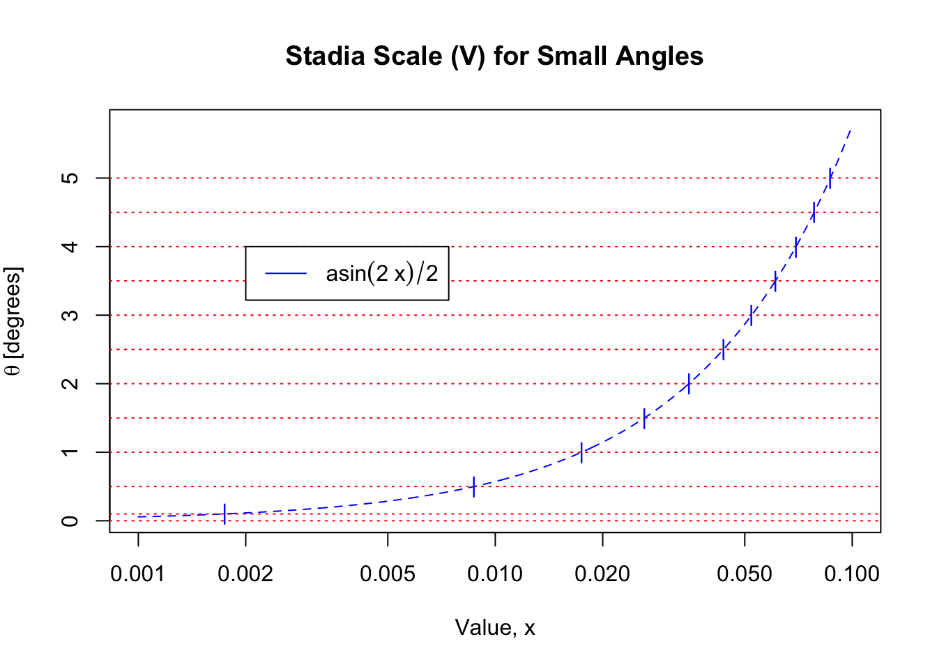 The horizontal spacing between the vertical hash lines in the plot above give the spacing of the five-degree markings on the major angular scale on the slide of the stadia rule, where the main axis shown would be represented by an A scale (i.e., two decades, from 0.01 to 1.0) on a standard slide rule: