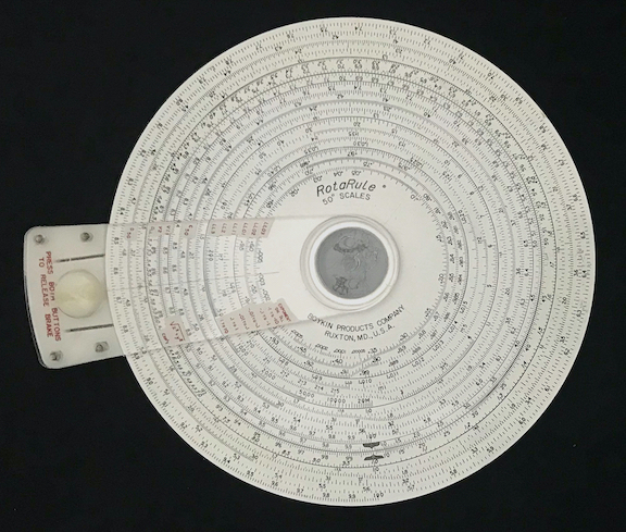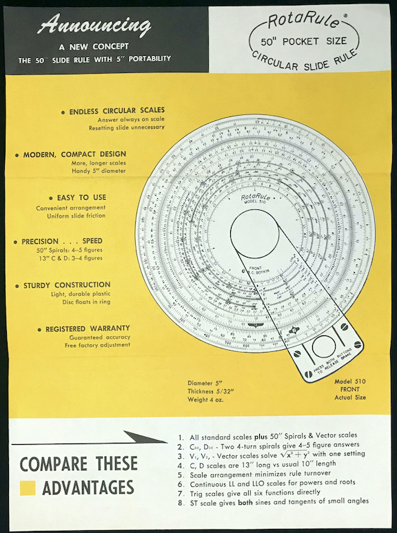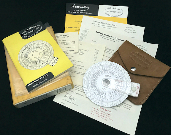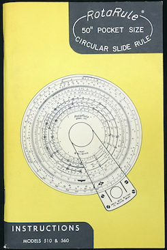 It was indeed a slide rule, labeled “Rota-Rule 50" Pocket Size Circular Slide Rule” on the initially-hidden side of the case. And the rule itself was quite elaborate with a large number of scales, an interesting “brake”-like handle, with a smooth operation when dialed. At that time I had never heard of a Rota-Rule, though I had been gathering slide rules for several years by then. The woman – the store’s owner – knew it was special, but hadn’t priced it yet, hence the NSF sticker. So, I gave her my info and said I would be very interested to hear from her if she could provide a price.