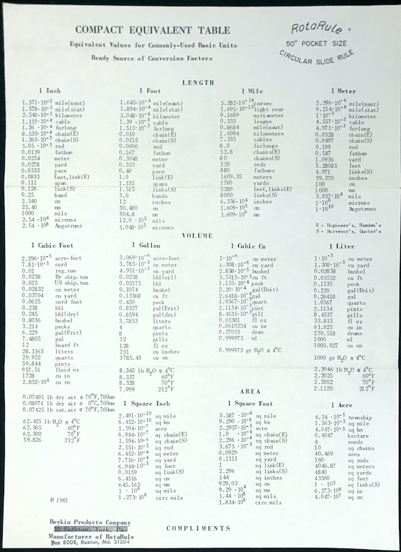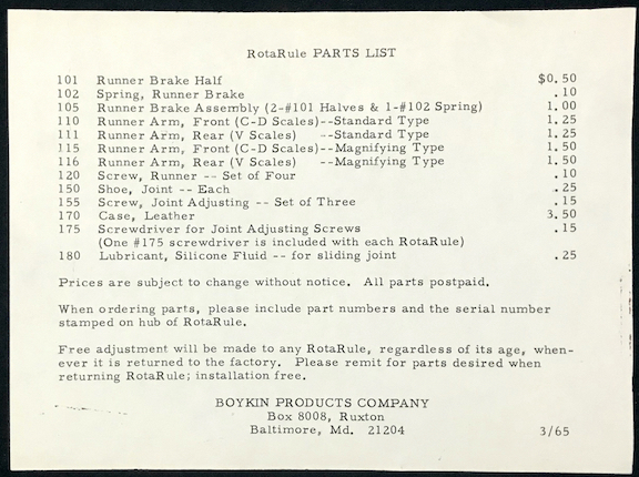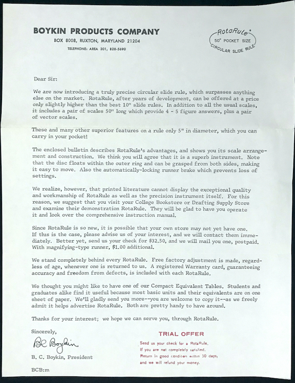 Leaving work the next day, I drove straight to the store and purchased the Rota-Rule before anyone changed their mind. After looking it over one last time (like I needed to do that…) and paying for the rule, the owner said to me, “Hey, wait a minute. I think I still have the box in the back. Let me go get that.” “Box?”, I thought. Wow, if it has its original box then its value just went up a notch. But when the box surfaced, it actually went up several notches – it was the original Rota-Rule box alright, and inside was: a (plastic wrapped) instruction booklet, a warranty card, two advertisement fliers (one three-holed punched), two copies of a double-sided Boykin-produced table of mathematical constants, a Parts List of Boykin products, and a Trial Offer letter from Mr. Boykin introducing the rule to the prospective owner, as well as a 1960’s magazine advertisement that was evidently obtained by the original owner thrown in for good measure! If the store owner noticed me shaking in my boots while she packed it all up, she didn’t let on.