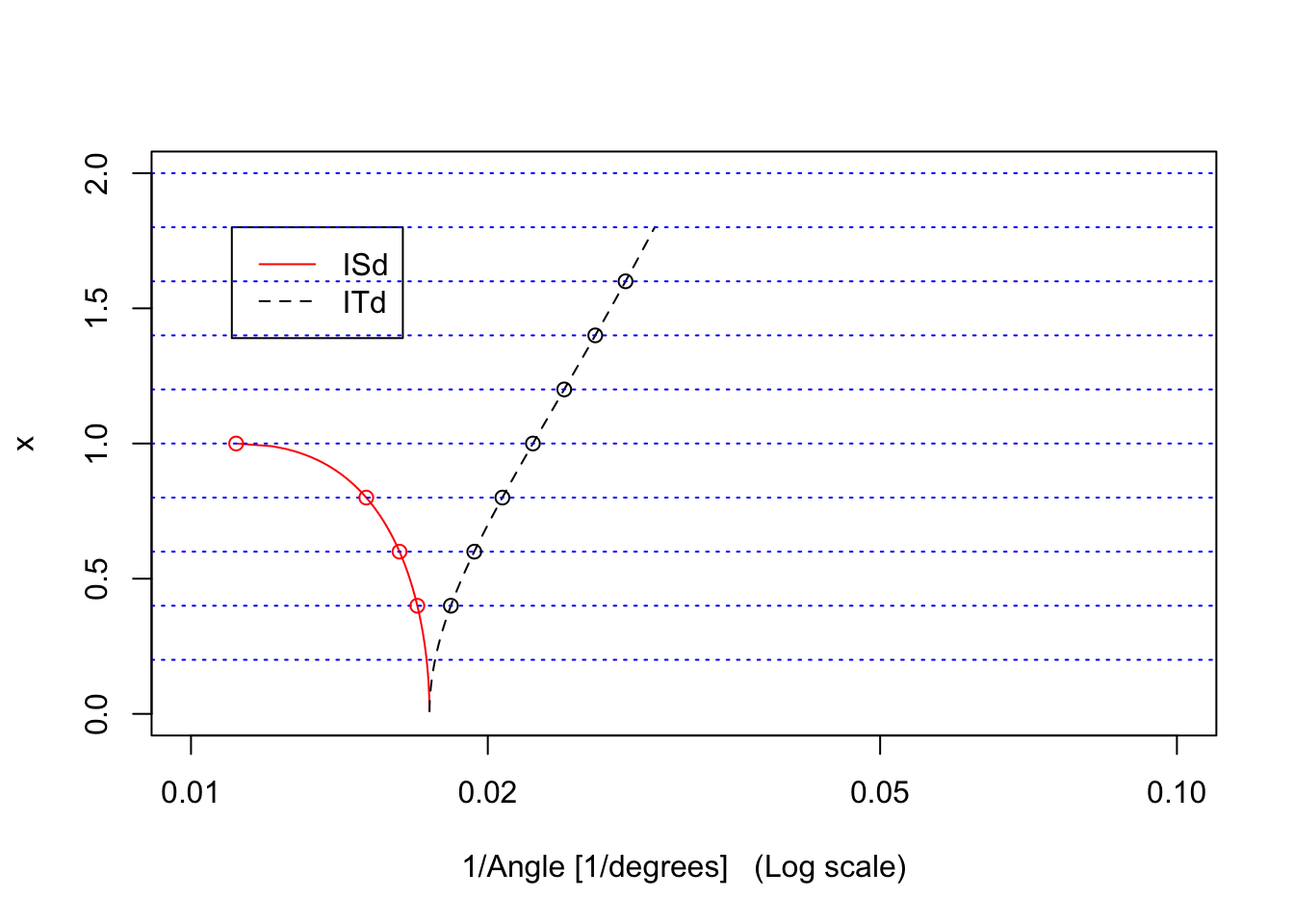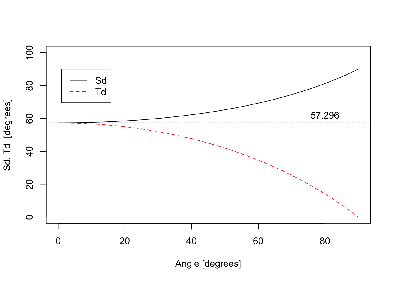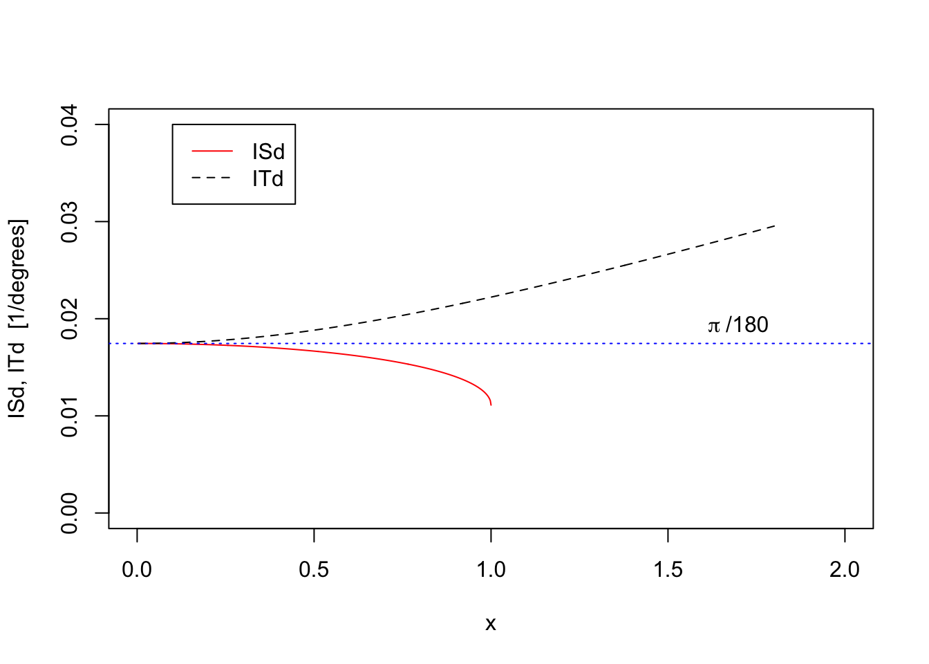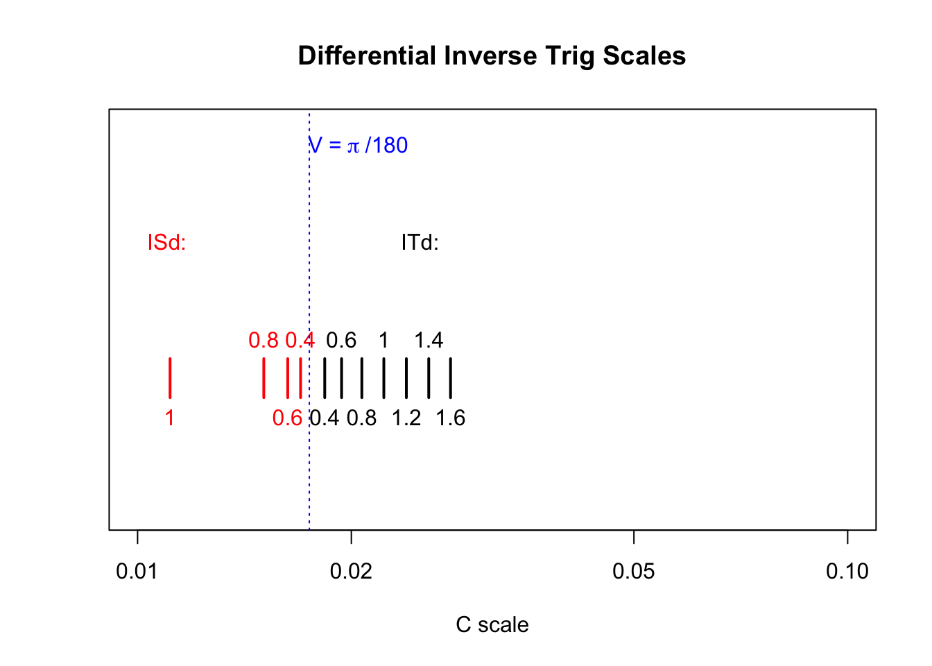 Since Sd/Td scales involve operations in units of degrees, then when performing the inverse operations we want the final answers to be in degrees as well. Hence, the units for ISd and ITd will be “inverse degrees” (i.e., 1/degrees) if we want the resulting \(\sin^{-1} x\) and \(\tan^{-1} x\) operations to result in degrees.