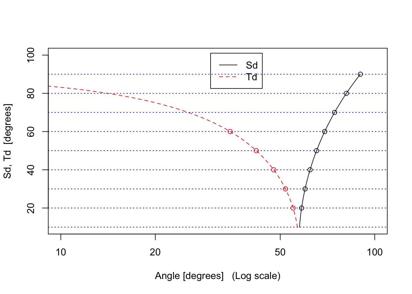 The Td and ITd scales are especially useful for angles in the range between 45 \(\lt\) \(\theta\) \(\lt\) 60 degrees.