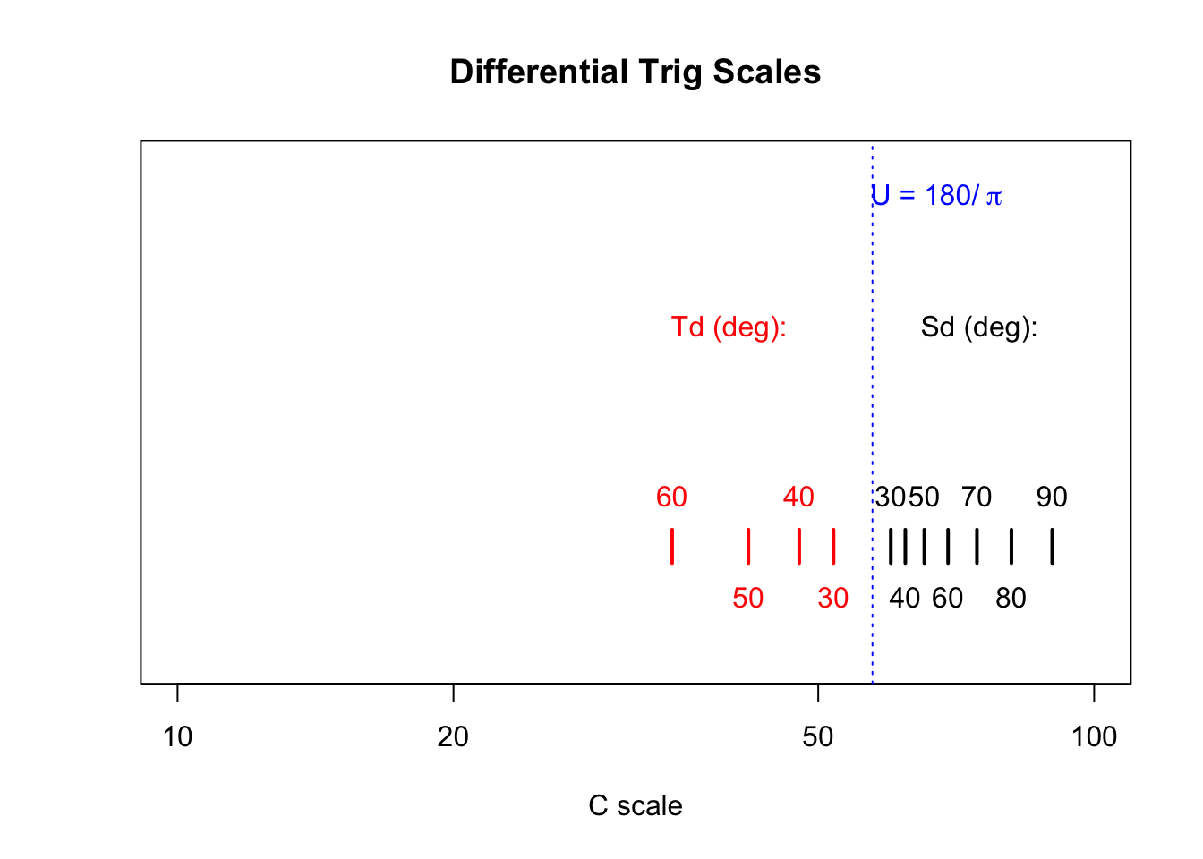 The blue horizontal lines are in increments of 10 degrees, so if we take points at the intersections of our curves with these blue lines, and lay them out along a rule with the spacing given above, we have illustrated the creation of the Sd and Td scales found on the British Thornton slide rule: