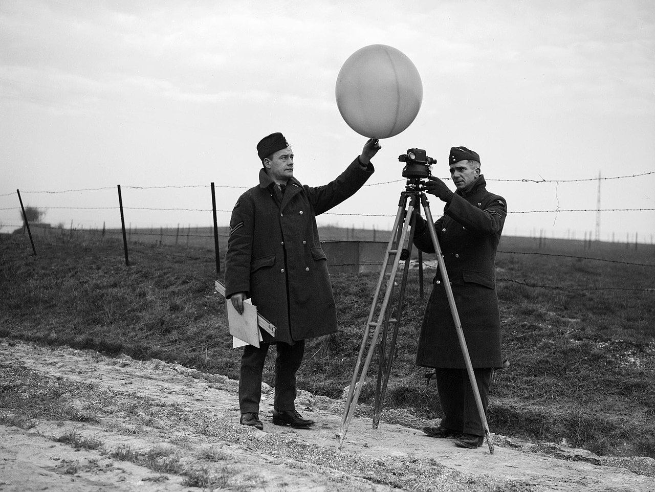 | An early weather balloon launch. (Photo courtesy The History of Weather Balloon.) | RAF corporals with balloon and theodolite in 1940 England. Notice the large slide rule held by the man on the left. (Photo courtesy Air Ministry Second World War Official Collection.) |