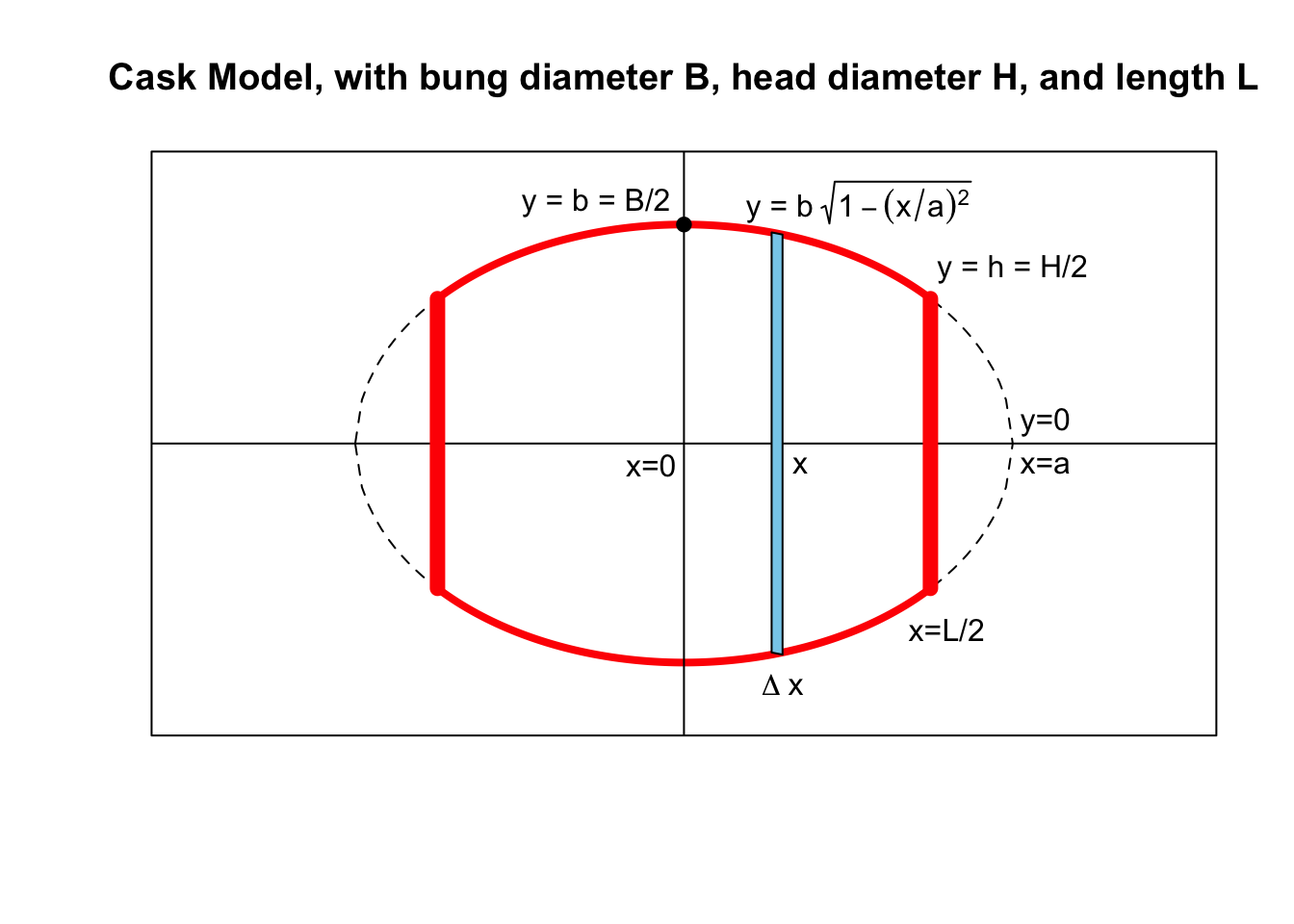 If the region inside the barrel is divided up into fine segments each of length \(\Delta x\) along the long axis, then each of these thin discs (one of which is depicted in light blue, above) along values of \(x\) can be thought of as its own cylinder and its individual volume would be \(\pi y^2 \Delta x\), where \(y\) is the distance to the inside of the barrel from the \(x\)-axis: \(y = \frac{B}{2}\sqrt{1-(x/a)^2}\). Summing up all of these volumes starting at \(x\) = 0 and ending at \(x=L/2\) would give an approximation of the volume of half the barrel. Multiply by 2 and you have the total volume. The remaining quantity in our description above is the semi-major axis, \(a.\) But this can be determined from our other defined parameters. For a spheroidal barrel described above, we find that