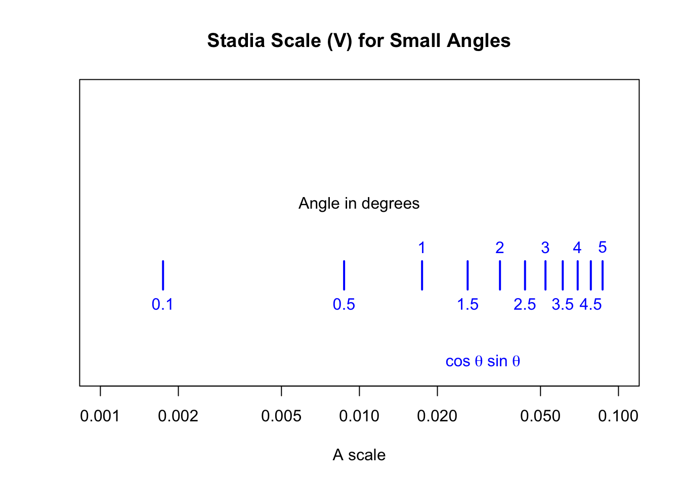 The horizontal spacing between the vertical hash lines in the plot above give the spacing of the five-degree markings on the major angular scale on the slide of the stadia rule, where the main axis shown would be represented by an A scale (i.e., two decades, from 0.01 to 1.0) on a standard slide rule: