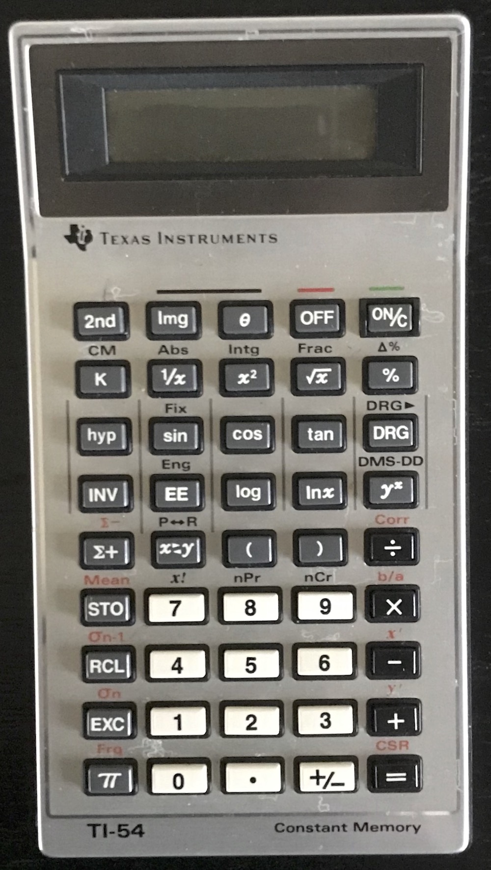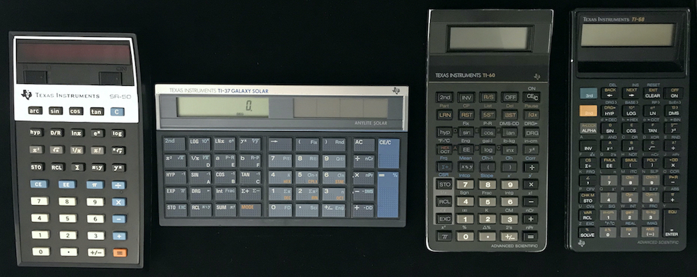 Left-to-Right: Texas Instruments Calculators SR-50 (1974) , TI-37 (solar; 1985), TI-60 (1988), and TI-68 (1990). Note that only the SR-50 is designated as a “slide rule calculator”. Unfortunately my favorite – the TI-54 (1981) slanted LCD calculator with complex number functionality – was destroyed in a flooded office in 1988 and replaced by the TI-60 above.
