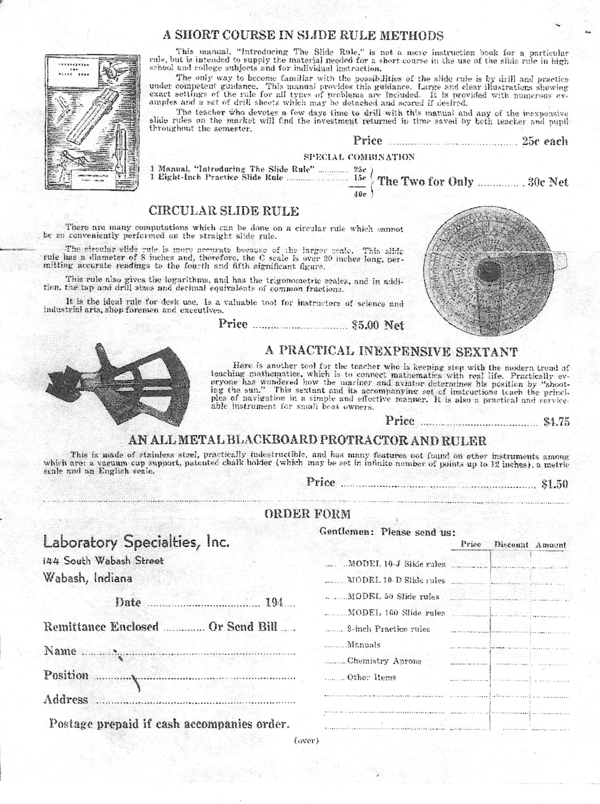 OK, so now back to Wabash, Indiana. Our newly acquired slide rule has “SOLD By Laboratory Specialists, Inc., Wabash, Indiana” on the back side. A little further research has revealed a couple of references to this company on the ISRM web site. Here we find a pdf of an order sheet that was distributed by LSI. The two-page order form is shown below:131