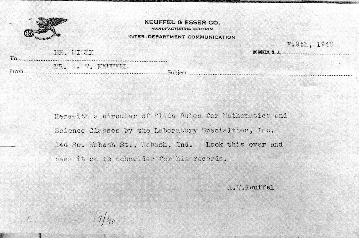 LSI evidently was formed to sell supplies to schools for use in science classrooms. We see that in early 1940 they were selling four standard slide rules and one “practice” rule, and that these slide rules have the same model numbers as those being manufactured by Acu-Rule. Our recently-found example is the Model 50, which has the beveled 10-inch ruler along the top edge. The above figure shows a date line on the order form for the customer to fill in: “194_”. But in addition, it turns out that this order form – originally acquired by George Keane and the MIT Museum – was accompanying a letter that was being distributed inside the Keuffel and Esser organization. The letter is shown here: