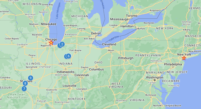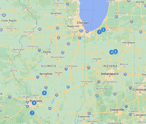 To help understand the relative distances between the companies being discussed, a few maps have been generated via Google Maps133 and are presented below. The map on the left is essentially one showing the Eastern United States, with the Mississippi River meandering north to south along the left edge of the image, through St. Louis. The cities of New York City and Chicago are also indicated. The map on the right is a closer view of the Indiana-Illinois region of the country. In all of the maps the companies being discussed are indicated in blue and numbered according to the table below.