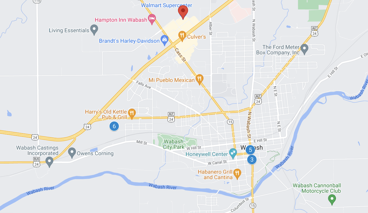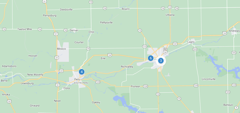 If we zoom in to the upper-middle region of Indiana, we see the towns of Peru and Wabash, which are located along the Wabash River. Lawrence Engineering was located in Wabash (3) for a short time, until relocating to Peru (4).