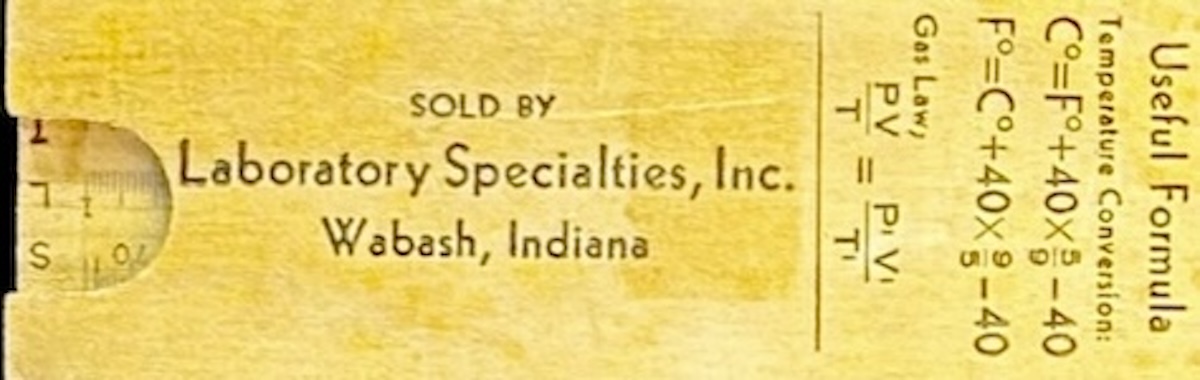 . Unfortunately it has no cursor. However, interesting to me was text on the back that reads, “SOLD By Laboratory Specialists, Inc., Wabash, Indiana”. That is probably enough for any Hoosier interested in slide rules to make the four dollar investment, which I did.
