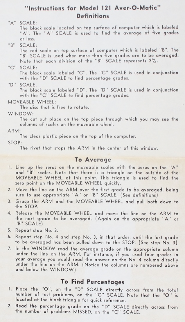 While the original motivation for the Aver-O-Matic might have been driven by Mims’ father’s interest in Greyhound racing, the final version of the AoM was likely marketed as a tool for the teaching profession. Teachers often need to find the average score for a series of exams, as an example, and the number of exams in a semester is generally fairly small. And, of course, the scoring of the exams themselves is also a common job. This second type of calculation is what constitutes the other function of the AoM. Its use in the education profession is also suggested by the wording at the bottom of the instructions that came with the slide rule.