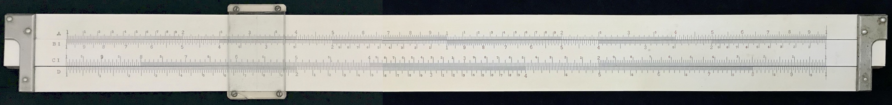 One of the best resources for information on K&E slide rules is Clark McCoy’s web site which contains immense documentation on K&E including scans of original catalogs. The first vector slide rule – the 4093-3 – was introduced by K&E in the late 1920’s. Their next-generation model – the 4083-3 – became available in 1939. But our rule is clearly from before 1922, as it does not have a serial number stamped onto it, which, according to the site, K&E began to provide starting that year. Also, the edges of duplex slide rules became laminated starting in 1922, and our rule has a bare edge. We also know that the K&E slide rules began using all-glass cursors in 1915, which this rule has. And the cursor blocks were metal in 1915, but were replaced with celluloid blocks starting in 1916 which this rule has. The McCoy site also has K&E catalogs for the years 1916 and 1921. The 4083 is not mentioned in the 1921 catalog, but it is listed as a 16-inch duplex in the 1916 catalog, selling for $12.00, a fairly high price for that time. But, sixteen inches? I had never bothered to measure it – I had assumed that what I had in my possession was a standard 20-inch rule. But now many months after the purchase I finally measured the distance between the 1 and the 10 on the C scale, and low and behold it was 16 inches! The McCoy site shows an image of a model 4083T, which is a 16-inch rule that includes trigonometric scales, but there is no image for the 4083. The scales on the model in my possession are: