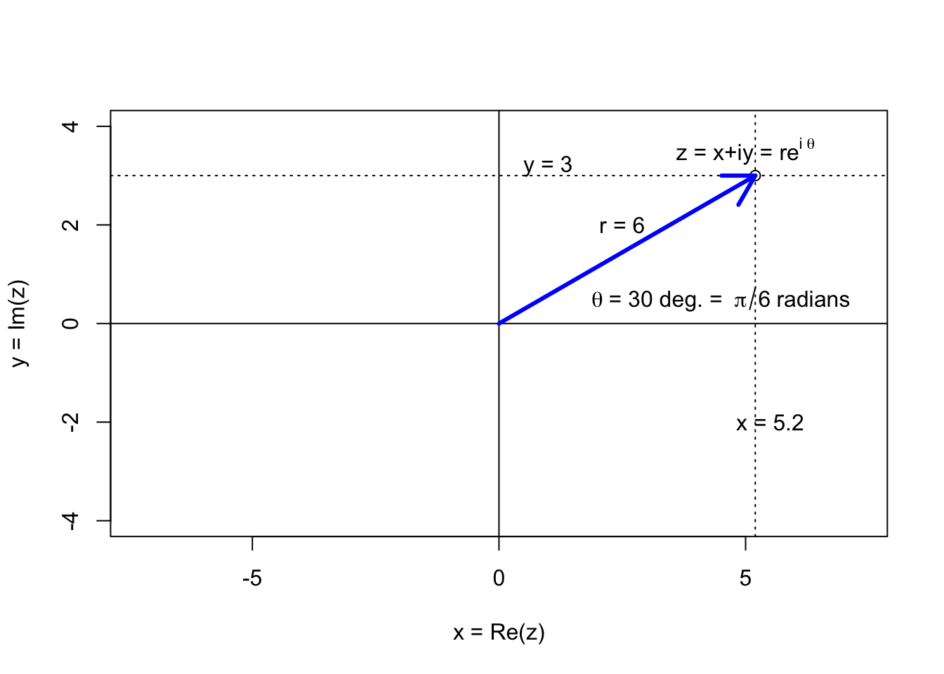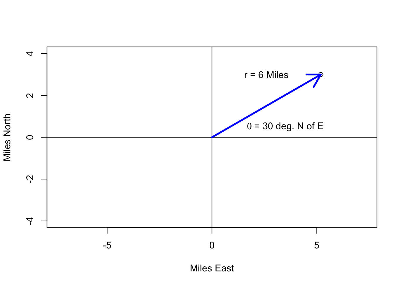 The phrase “complex vector calculation” does not refer simply to a “complicated” procedure; reference is to an operation on a specific type of object – a vector – that has two components (for the case of interest here). A complex number or a vector in the present context can be thought of as an ordered-pair of two numbers, such as a set of coordinates. On a map, moving to a point six miles away, 30 degrees North of East, can be represented as a vector. On the map, one might draw an arrow from the original point to the new point; the arrow has a length corresponding to 6 miles, and is pointed at an angle of 30\(^\circ\) north of due-east – two numbers are required to define the vector. Getting to this point would also be equivalent to moving 5.2 miles East and 3 miles North – again, two numbers are involved.