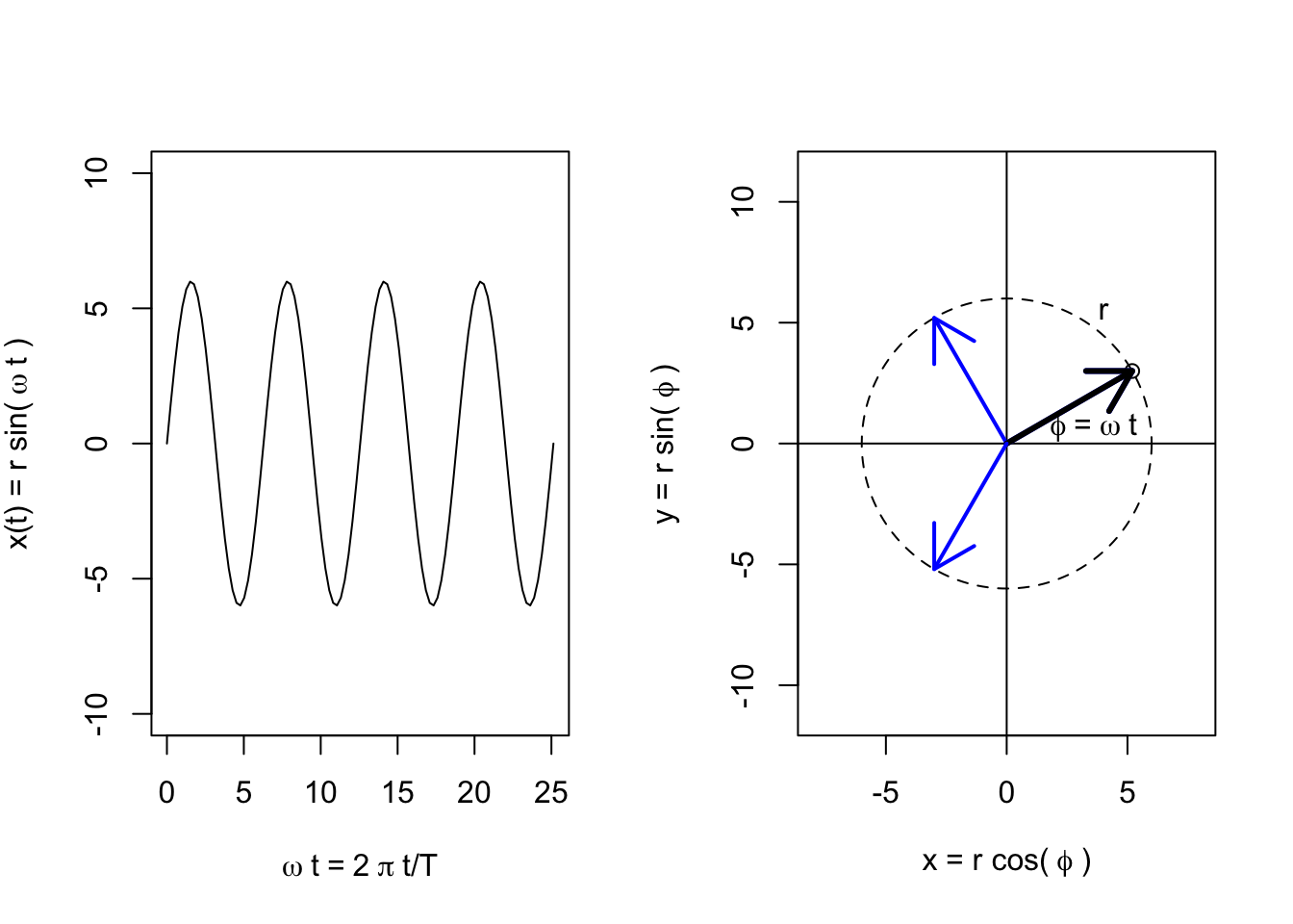 We are familiar with the standard trigonometric functions sine, cosine and tangent which were discussed in Trigonometric Scales. Combinations of these functions – the sine and cosine particularly – are solutions to systems which oscillate in time with constant amplitudes. For example, consider a vector like the one in our figure above. It has an amplitude (6 miles, in the example), call it \(r\), and a phase angle (30 degrees in our example), call it \(\theta\). Imagine that an object were to move along a circle of constant radius \(r\), with its angle \(\theta\) advancing at a constant rate, i.e., \(\theta = \omega \cdot t\). Though the length of the vector remains unchanged, it will rotate with time according to the advancement of the angle \(\theta\) = \(\omega t\), and the horizontal and vertical coordinates (\(x\) and \(y\)) on the map will oscillate according to