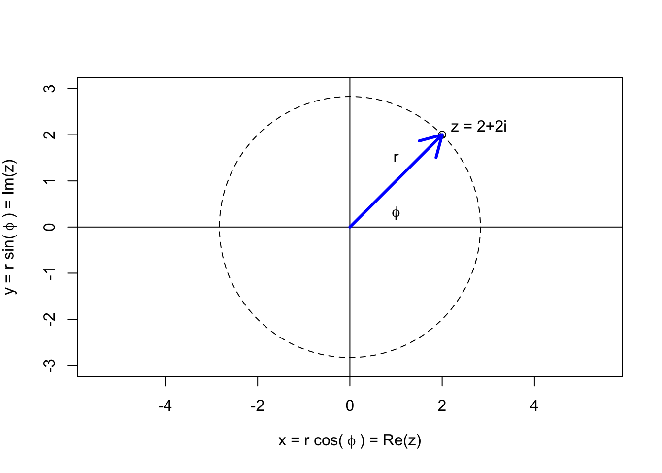In this example, the length of the phasor is \(r = \sqrt{8}\), while the phase angle has a value of \(\phi\) = 45 degrees (or, \(\pi/4\) radians).