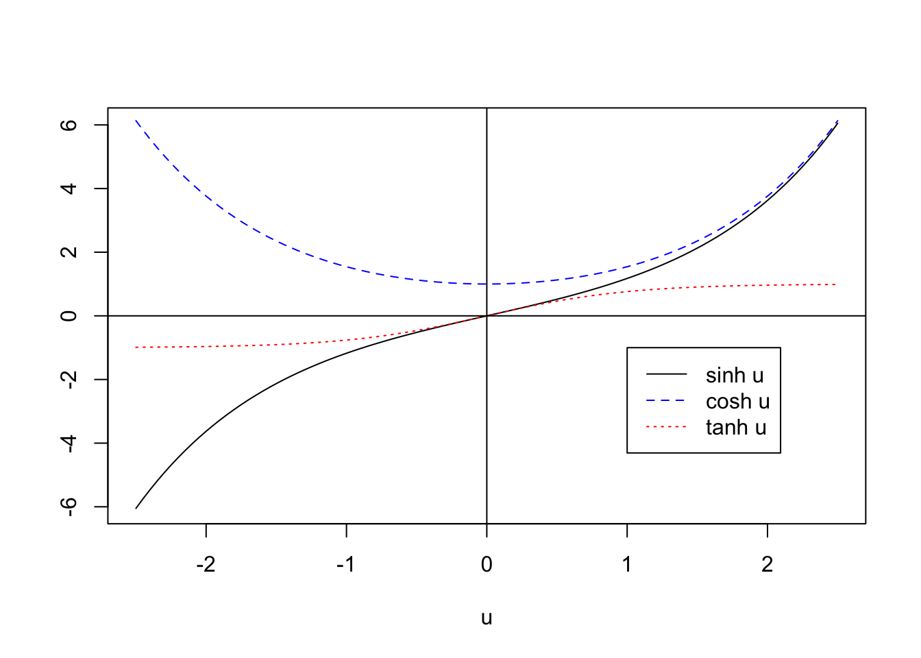 \[ \sinh(u) = \frac{e^{u}-e^{-u}}{2}; ~~~~~~~ \cosh(u) = \frac{e^{u}+e^{-u}}{2} ; ~~~~~~~ \tanh(u) = \frac{e^{u}-e^{-u}}{e^{u}+e^{-u}}, \]