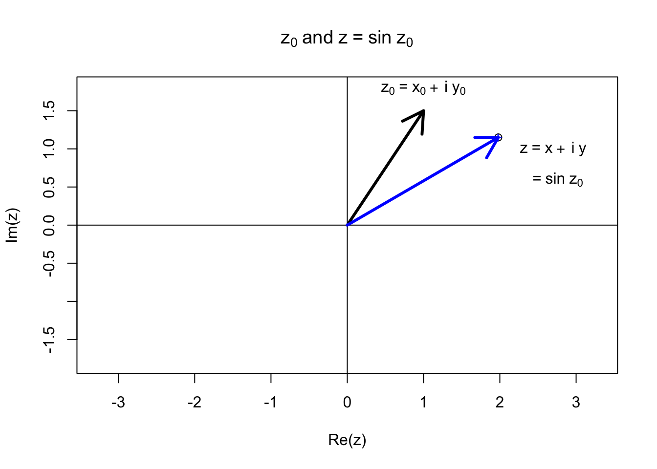 So given a complex number \(z_0 = x_0 + i y_0\), taking the sine of \(z_0\) will yield a new complex number \(z\) given by