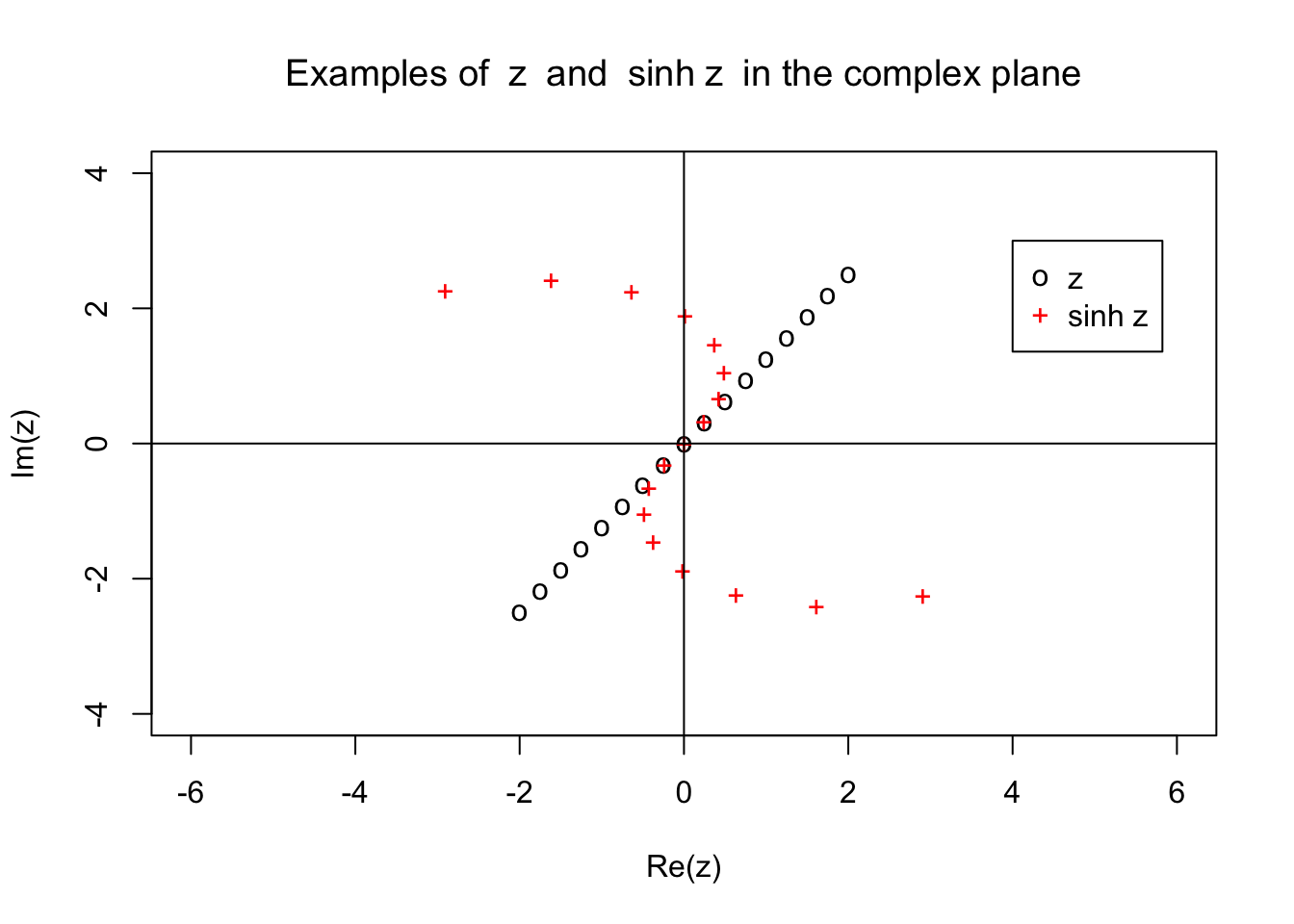For fun, a plot of \(\sinh z\) for a small collection of complex values \(z\) is created below. Here, the initial \((x_0,y_0)\) (“o”’s) and final \((x,y)\) (“+”’s) points in the complex plane are plotted, rather than drawing arrows from the origin: