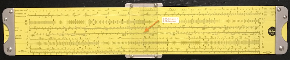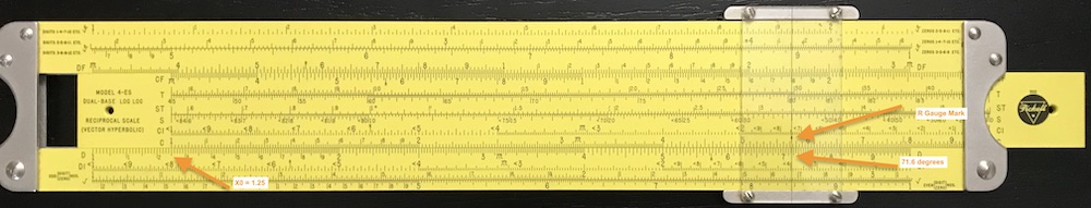 - Line up the cursor on 1.25; line up the “1” under the cursor; slide cursor to the R gauge mark; read off degrees (= 71.6);
