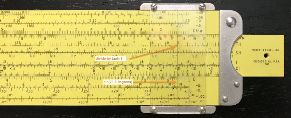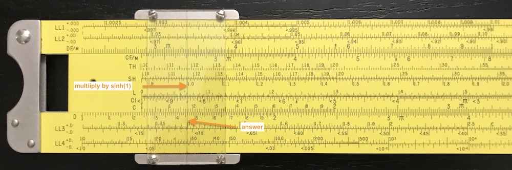 Taking one of the points in the plot above, the calculation of \(\sinh z_0\) is now performed on a slide rule. To illustrate, the Pickett Model 4-ES is used for our calculation. Suppose \(z_0 = 1 + 1.25i\). The desired result is \(z = \sinh z_0 = \sinh 1\cos 1.25 + i\cosh 1\sin 1.25\). Most rules, including the one used here, express the arguments of the standard trig functions in units of degrees rather than radians, and so the \(\sin\) and \(\cos\) arguments above must be converted accordingly. On the 4-ES there is a Gauge Mark “R” at 5.73 on the C/D scales – 57.3 degrees per radian – so this feature is used.