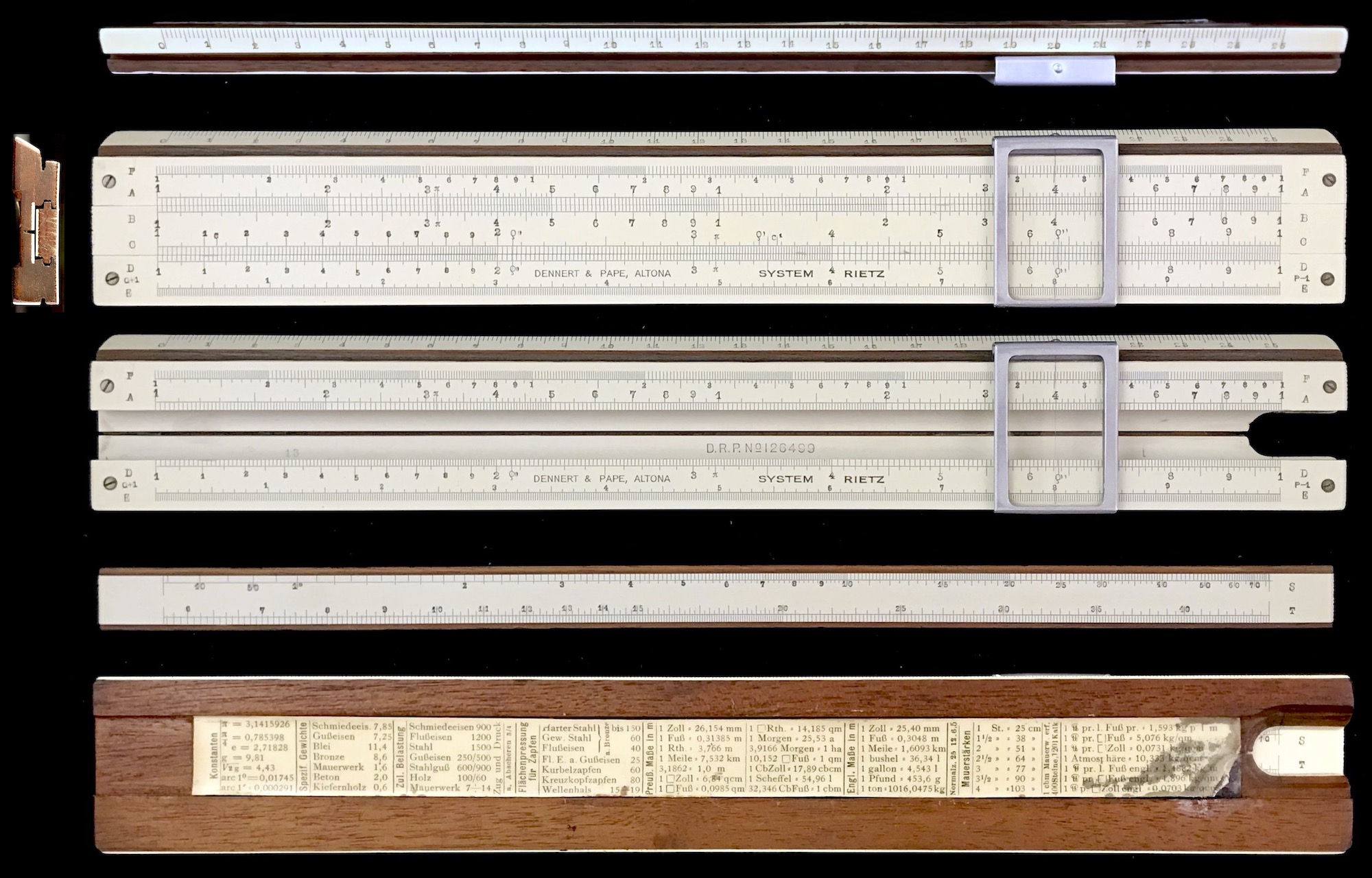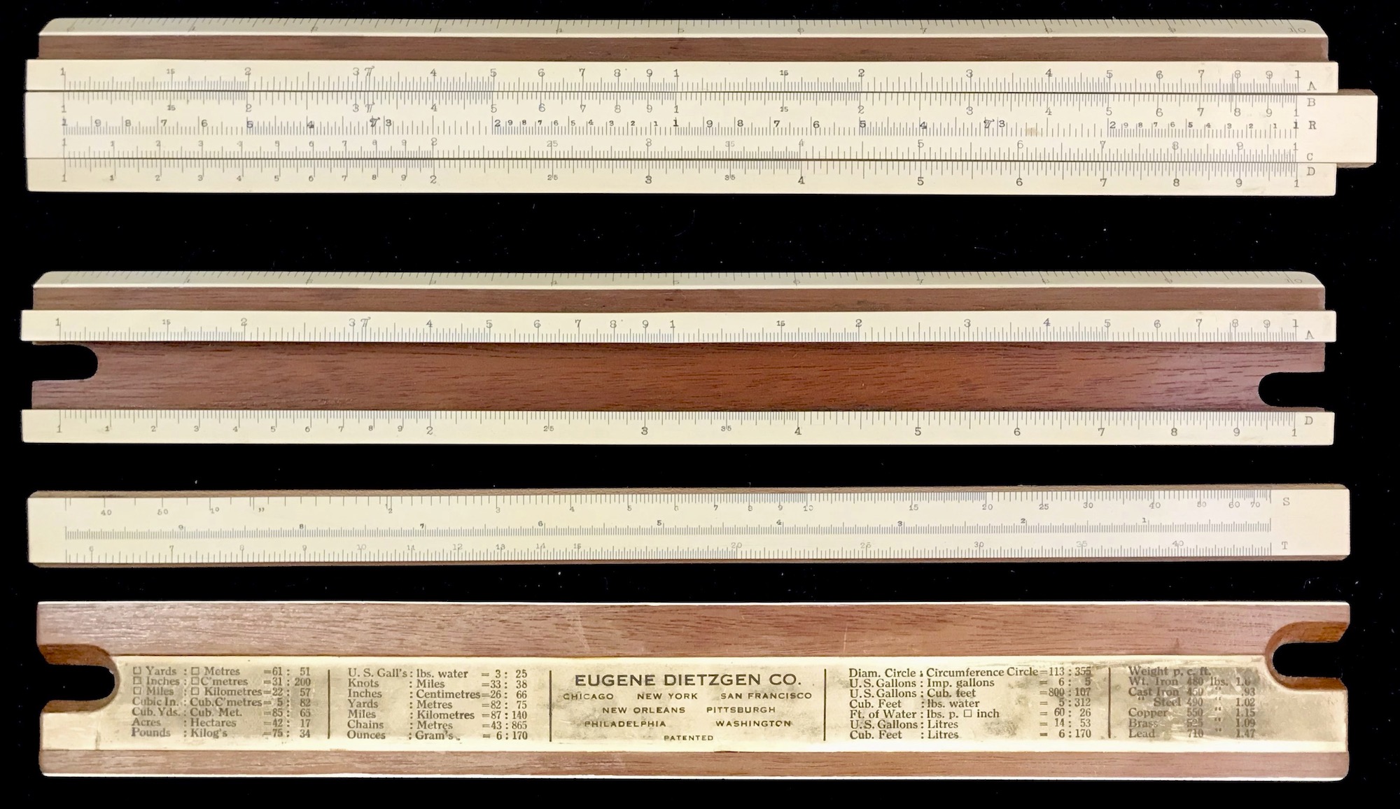 Variations in scale arrangements continued. See, for example, Dietzgen’s 1759-B with its R scale. Metal slide rules made their entrance in the U.S. during this decade as well. The Reitz scale arrangement was developed in Germany, which included K and L scales on the front with trig scales on the back of the slide. The K&E duplex models that include log-log scales for advanced calculations begin to gain popularity during this decade.